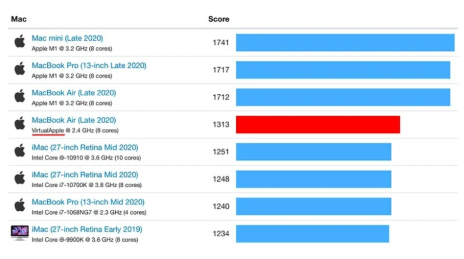 기존 맥과 비교해서도 훨씬 뛰어난 성능을 자랑합니다. 게다가... 로제타 2를 통해 실행되기 때문에 성능이 100%를 내지 못함에도 압도하는 성능을 보여줍니다. 로제타 2 실행 x86 코드는 애플 실리콘 코드의 78%-79% 성능을 달성하고 있는 것으로 보인다는 글들도 있었는데 이쯤되면 인텔이 그동안 너무 못만들었나 싶은 생각까지 드네요;;; 애플은 정말 미치 치밀하게 준비하고 시뮬레이션까지 다 끝내 놓은 후에 인텔 너네랑 빠이 할꺼야!!!! 라고 한 것 같습니다. 에잉 이것들 이제 못미덥네 하면서요.